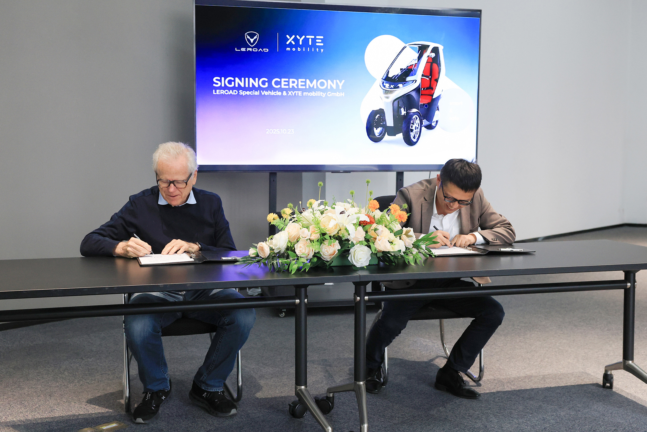 2025年10月23日,嘉興 —— 嘉興領鹿特種車有限公司(以下簡稱「領鹿」)與德國微出行企業 XYTE GmbH(以下簡稱「XYTE」)正式簽署策略合作協議。隨著雙方合作關係的確立,領鹿將成為XYTE新產品的研發合作夥伴與合約製造商,同時,領鹿母公司 SOE 亦將透過投資成為XYTE的股東。
